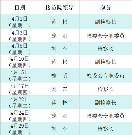 为深入贯彻习近平法治思想,践行新时代检察机关以人民为中心的发展思想,进一步密切检察机关同人民群众的联系,提升12309检察服务中心服务质效,扎实做好检察长接访工作,推动案结事了人和,我院坚持开展12309检察服务中心“检察长接访日”活动,现将本院“检察长接访日”2025年4月接访安排公告如下: