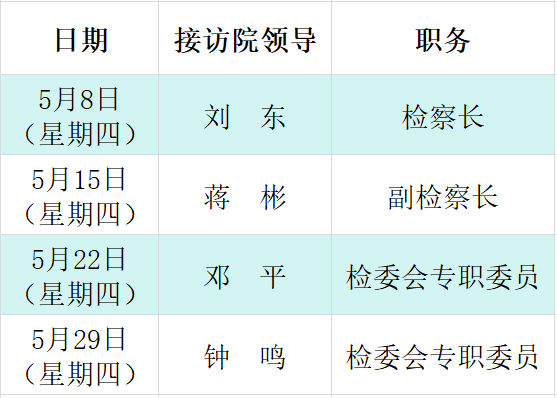 为深入贯彻习近平法治思想,践行新时代检察机关以人民为中心的发展思想,进一步密切检察机关同人民群众的联系,提升12309检察服务中心服务质效,扎实做好检察长接访工作,推动案结事了人和,我院坚持开展12309检察服务中心“检察长接访日”活动,现将本院“检察长接访日”2025年5月接访安排公告如下: